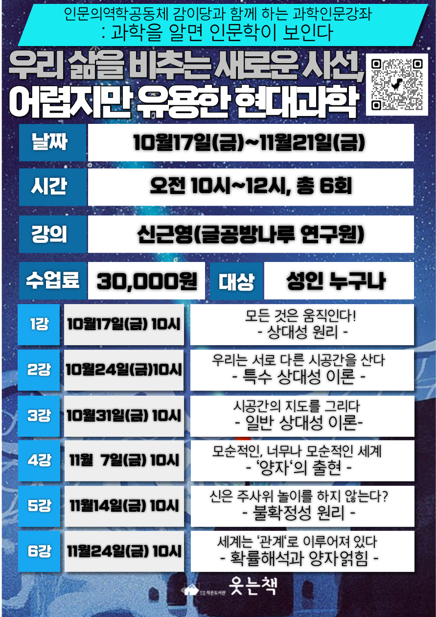 안녕하세요! 구립 작은도서관 웃는책 가을 인문강좌를 소개합니다 ☺ '과학을 알면 인문학이 보인다!' 알고 나면 세상을 바라보는 눈이 달라집니다! 복잡한 공식 대신, 편히 이야기를 나누며 과학의 세계로 걸어가보시겠어요~?(ㅎㅎ) ↓↓ 강좌 신청 아래로 ↓↓ |